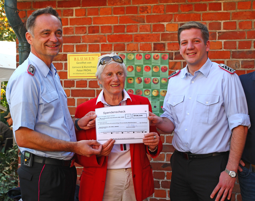 Um 14 Uhr waren bereits die Bratkartoffeln mit Grützwurst und Apfelmus sowie die Apfel-Kürbissuppe ausverkauft … und nur eine Stunde später die Waffeln, die 38 Apfelkuchen sowie Kaffee und Sahne. Der guten Laune der über tausend Gäste tat das aber keinen Abbruch, konnten sie doch währenddessen den schönen Garten, die Sonne und fröhliche Akkordeonmusik des Duos Christa Stolz & Ysbrand Bouma genießen. Die fleißigen Feuerwehrleute pressten laufend frischen Apfelsaft, der sofort konsumiert und auch in Flaschen mitgenommen wurde.
