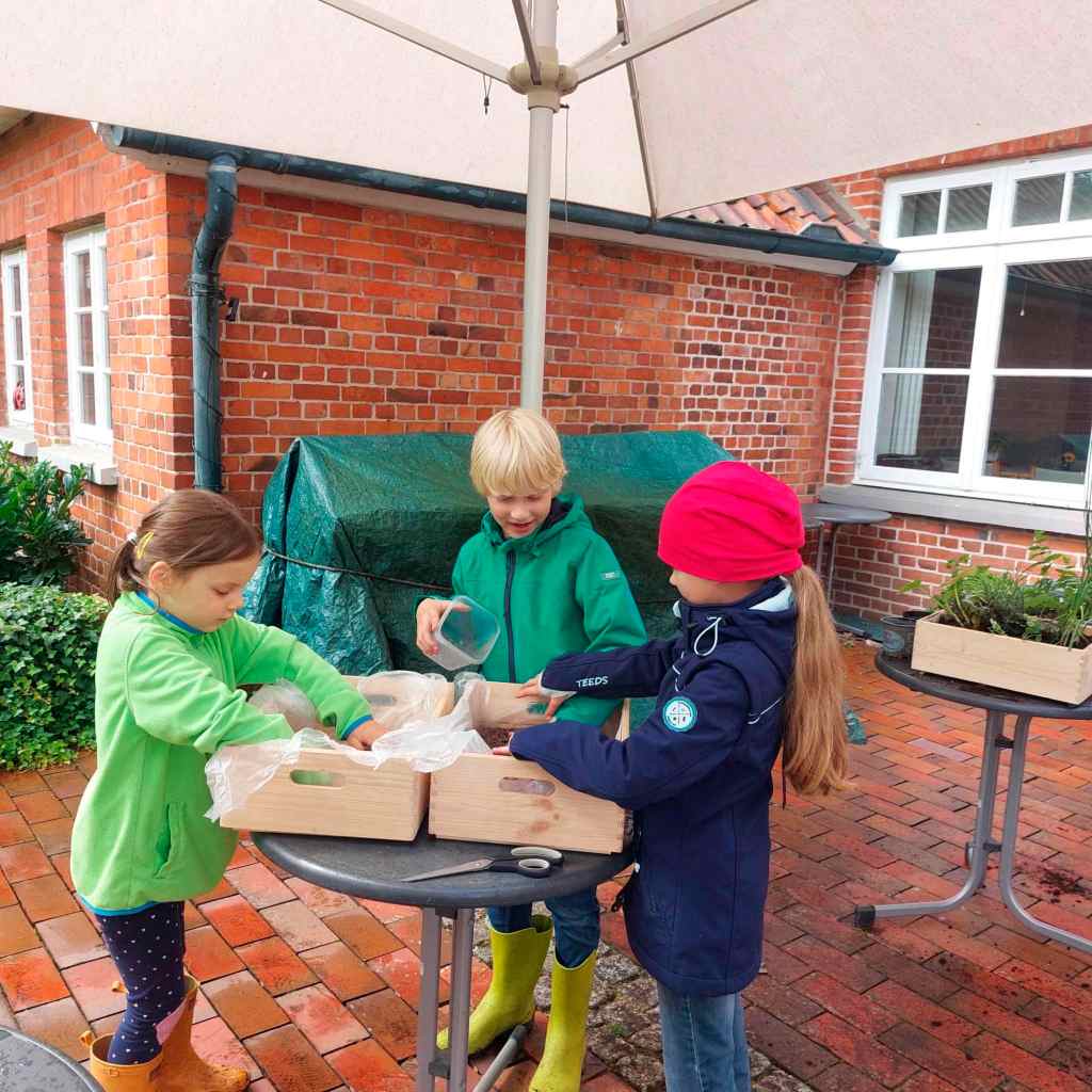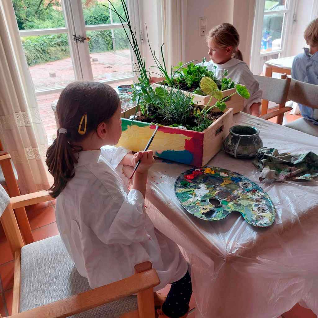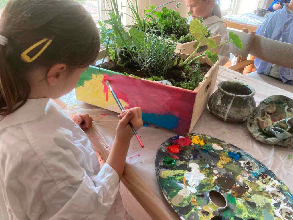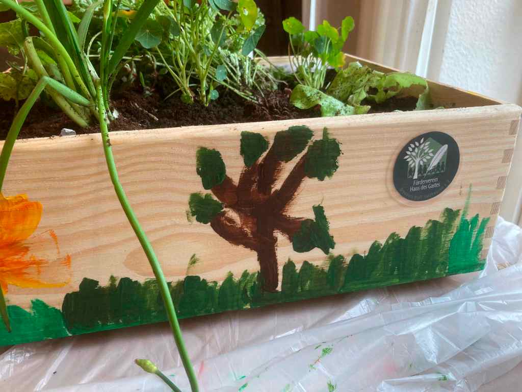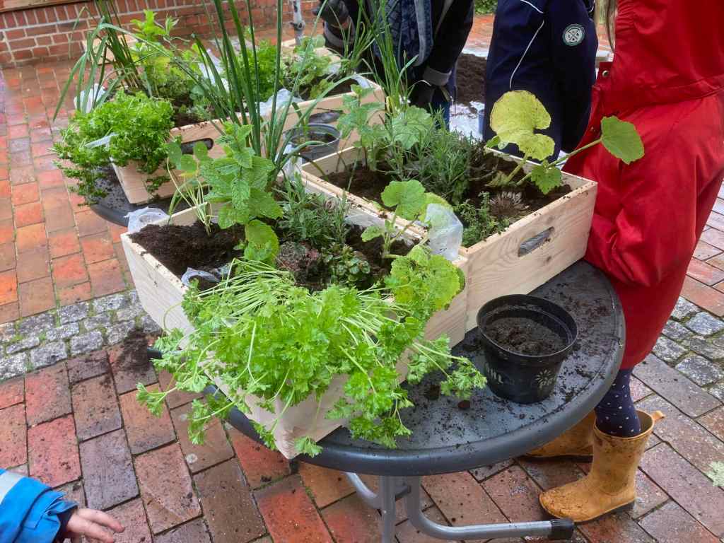 Aus einer Auswahl an vorgezogenen Pflanzen wie verschiedenen Kräutern, Kürbissen oder Kapuzinerkresse haben sich die Kinder ausgesucht, was sie pflanzen wollten. Die Pflanzbehälter konnten zusätzlich dekoriert und im Anschluss mit nach Hause genommen werden.