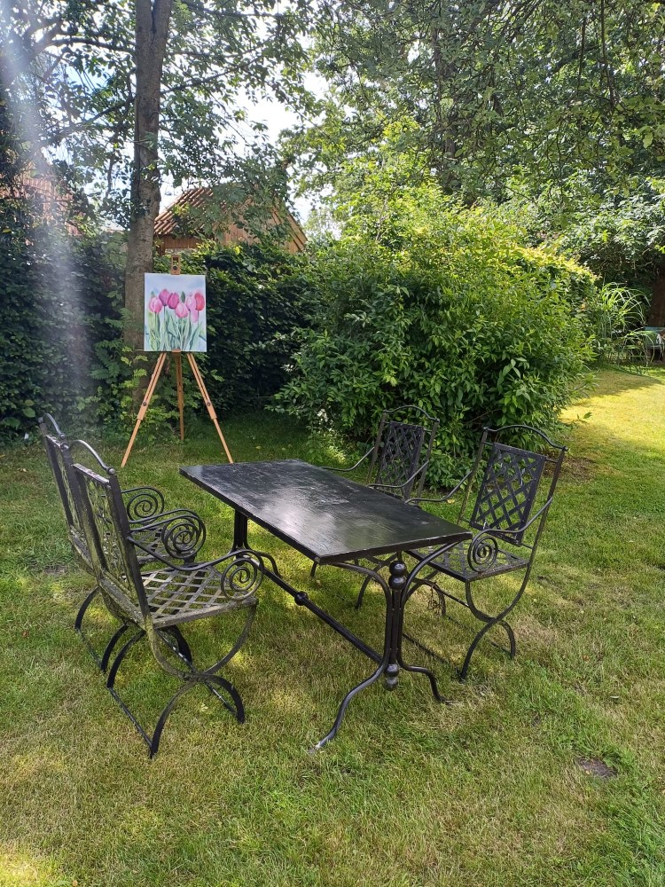 | Doris Nolte Am Lerchenberg 22 | Ländlicher Garten, ca. 900 m², gegliedert in verschiedene Bereiche. Ein vielfältiger schmetterlingsattraktiver Staudengarten, Buchsbaumbeete, Obstbäume sowie ein Spiel- und Spaßbereich bilden ein kleines Paradies, das aus dem Blickwinkel unterschiedlicher Sitz- und Verweilplätze immer neue Perspektiven bietet. – Ausstellung ›Aquarelle‹ |
