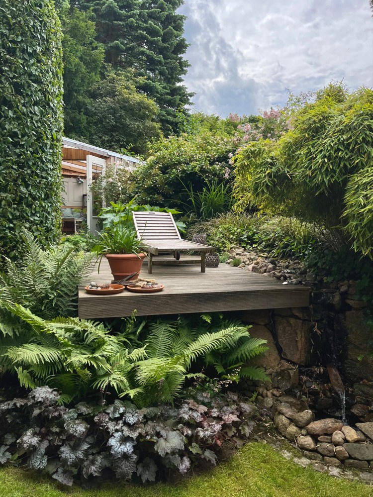 | Ina & Michael Leupold Eschenweg 5 | Ein ca. 800 m² großer, in verschiedene Bereiche aufgeteilter Familiengarten, der seit 26 Jahren immer wieder auf die aktuellen Bedürfnisse seiner Bewohner um- und weitergestaltet wird. Neben Blumenbeeten, Sitzecken und Natursteinmauern entstand ein kleines gemütliches Gewächshaus. Ein höher gelegenes Sonnendeck aus Holz mit angrenzendem Bachlauf lädt zum Verweilen ein und bildet das Herzstück des Gartens. |